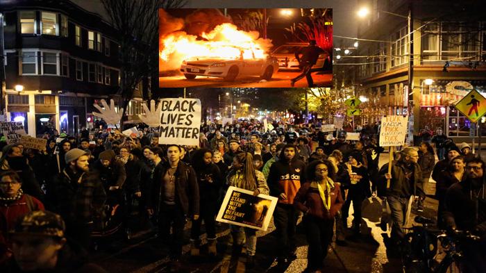 مسيرة حاشدة لمحتجين على قرار هيئة المحلفين بتبرئة الضابط الأبيض في مقتل الشاب الأسود. وفي الإطار سيارة شرطة بعد إحراقها في الاحتجاجات التي تلف فيرغسون