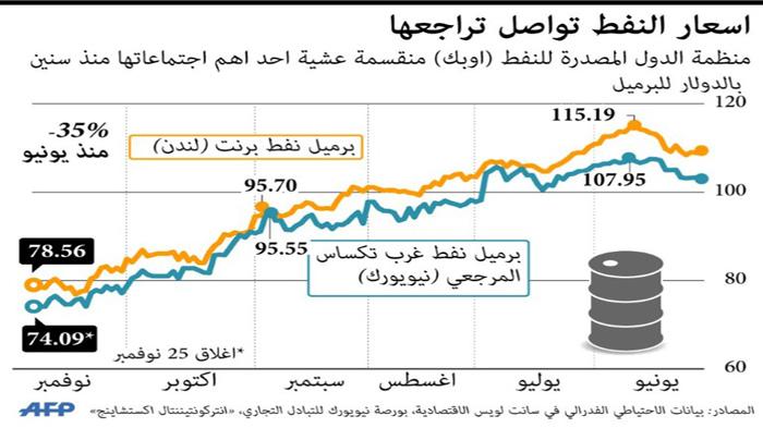 وسجل مزيج برنت الخام 78.97 دولاراً للبرميل منخفضا 71 سنتا.وفي وقت سابق من التعاملات هوى سعر برنت أكثر من دولار للبرميل بعد ان انتهى اجتماع بين السعودية وفنزويلا وروسيا والمكسيك دون التوصل الى اتفاق على خفض الانتاج.