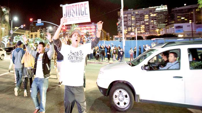 وترددت أصداء الغضب حتى في لندن حيث تظاهر آلاف الاشخاص أمام سفارة الولايات المتحدة، وكرروا شعارات رفعت في فيرغسون «حياة السود غالية» و«ارفع يديك ولا تطلق النار».