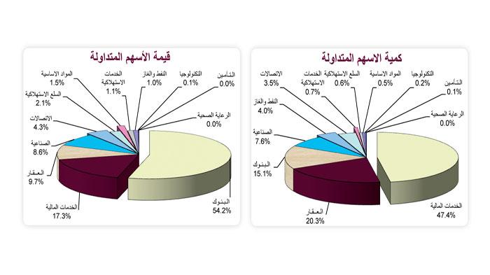 وعن القطاعات الأكثر نشاطاً من حيث قيمة الأسهم المتداولة لفت التقرير الى ان قطاع البنوك استمر بالمرتبة الأولى للتداول من حيث قيمة الأسهم المتداولة والتي بلغت قيمتها 58.7 مليون دينار بنسبة %54.2 من اجمالي قيمة الأسهم المتداولة وذلك من خلال تداول 120.0 مليون سهم بنسبة %15.1 موزعة على 2.846 صفقة بنسبة %15.9.