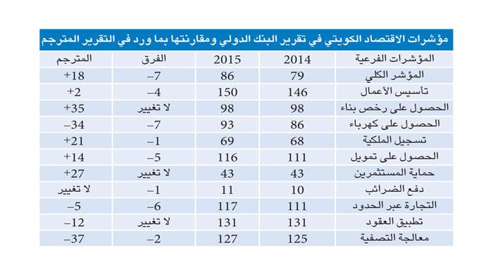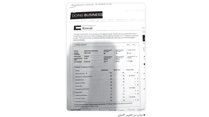 وتابعت المصادر: للاطلاع على التفاصيل الخاصة بالمؤشرات الفرعية لمؤشر ممارسة أنشطة الأعمال تم الرجوع الى التقرير الأصلي على الموقع الالكتروني الرسمي للبنك الدولي، وعند مطابقة الأرقام كشفت المراجعة عكس ما ورد في التقرير المترجم، حيث اظهر التقرير الاصلي تراجع الكويت من الترتيب 79 في عام 2014 الى الترتيب 86 أي بتراجع مقداره سبع درجات وليس تقدما بـ18 درجة كما ورد في التقرير.