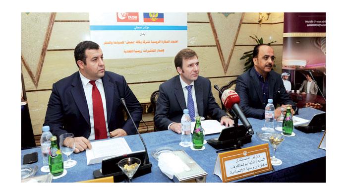 بولغاكوف متوسطاً كارابيكوف والسمهورى خلال المؤتمر الصحافي أمس لاعتماد «يعيش» لإصدار التأشيرات (تصوير: إسماعيل عبدالقادر)