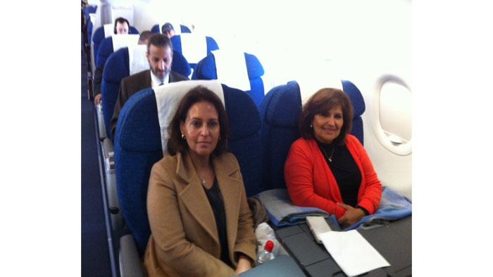 رشا الرومي ونبيلة العنجري خلال رحلة العودة على متن الطائرة الجديدة