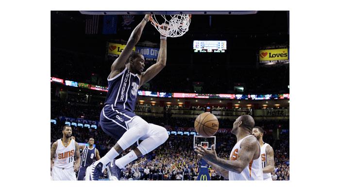حقق كيفن دورانت افضل لاعب في الموسم الماضي عودة مظفرة الى الملاعب وقاد فريقه اوكلاهوما سيتي ثاندر على ضيفه فينيكس صنز 134/137 بعد التمديد على ملعب «تشيسابيك اينرجي ارينا»: وامام 18203 متفرجين ضمن دوري كرة السلة الأمريكي للمحترفين.