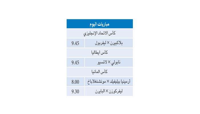 ويلعب اليوم أيضا بوروسيا مونشنغلادباخ الذي يحتل المركز الثالث في البوندسليغا مع مضيفه أرمينيا بيليفيلد من الدرجة الثالثة والذي أقصى فيردر بريمن من ثمن النهائي بفوزه عليه 1-3.