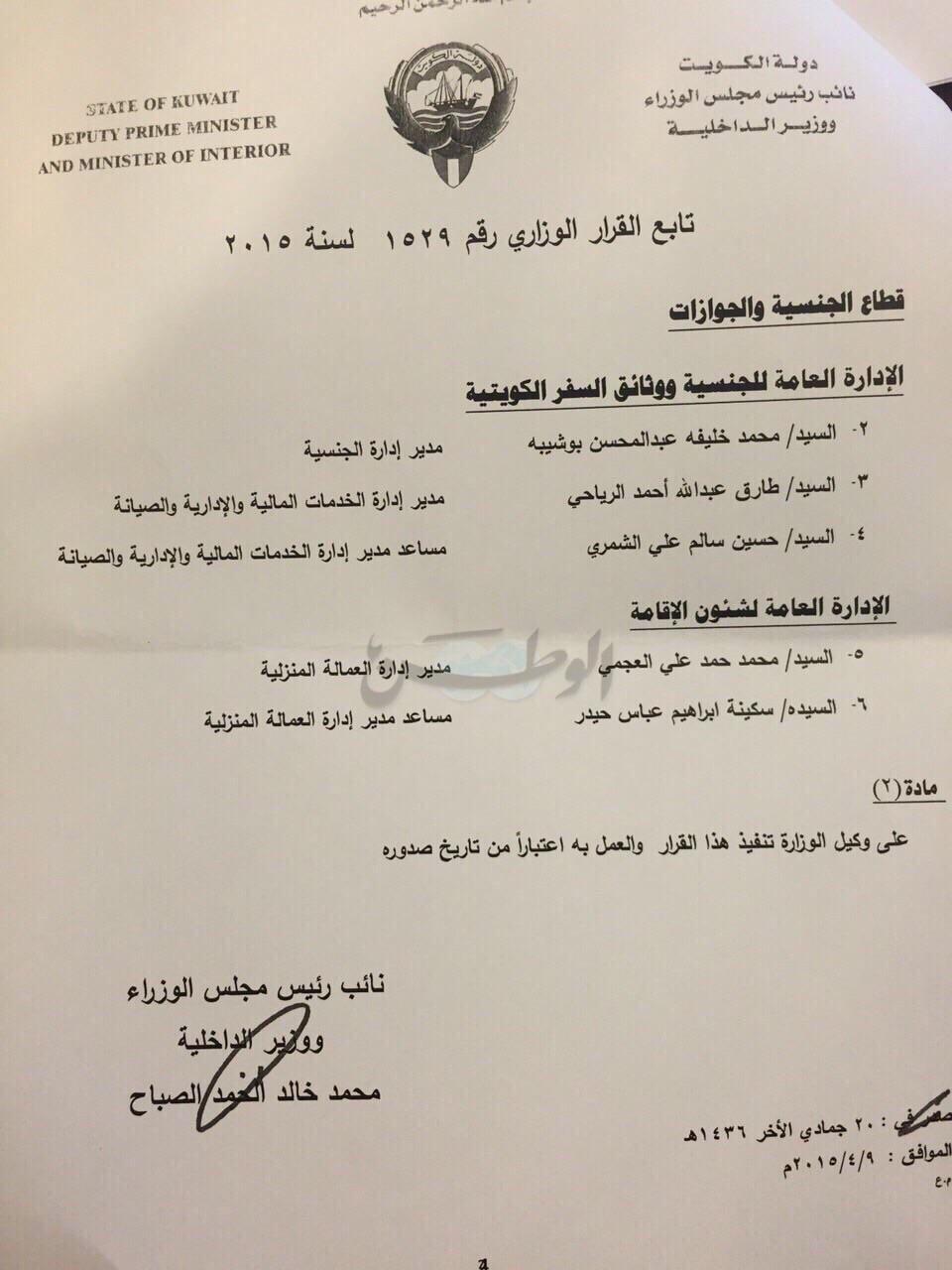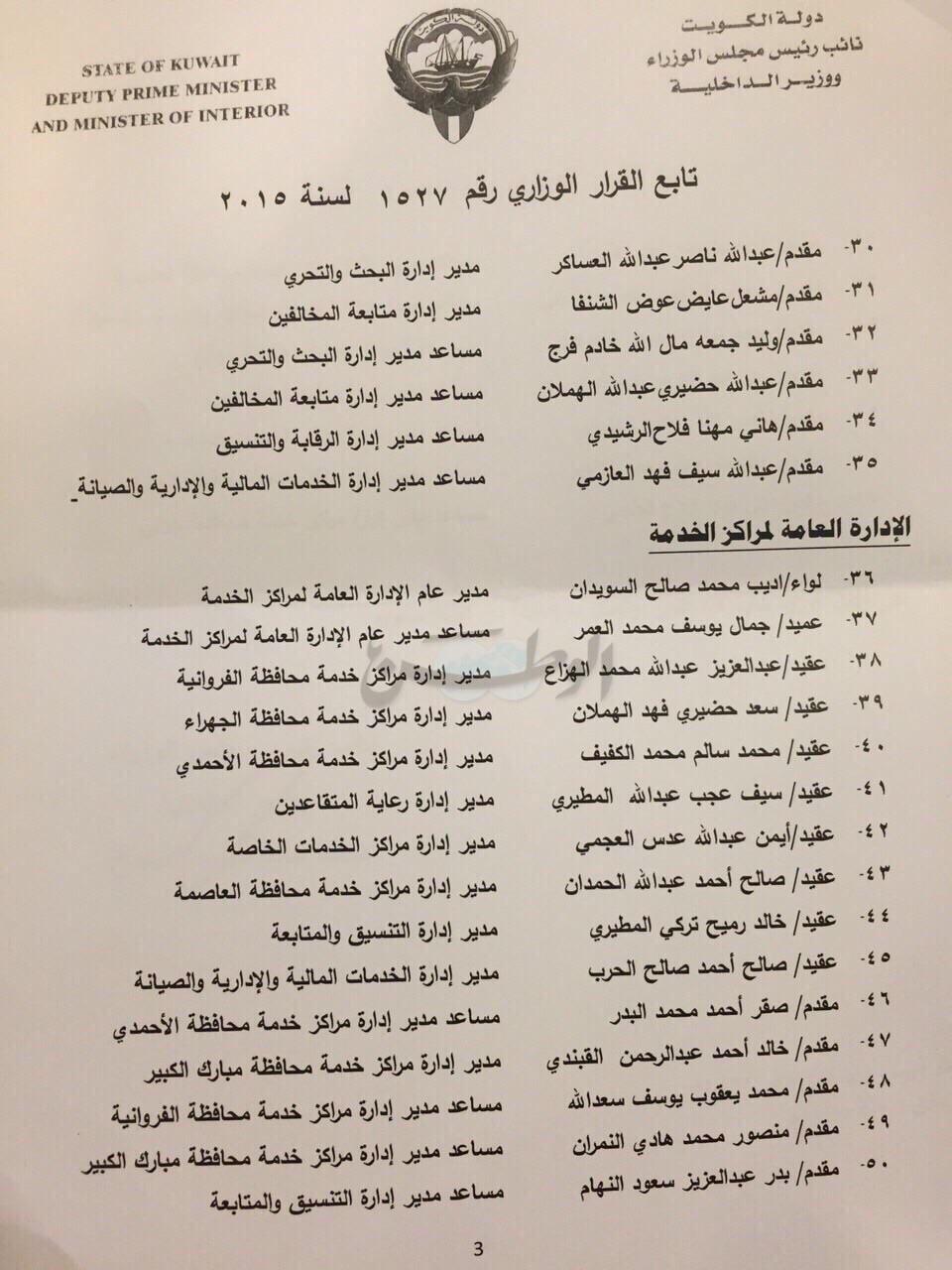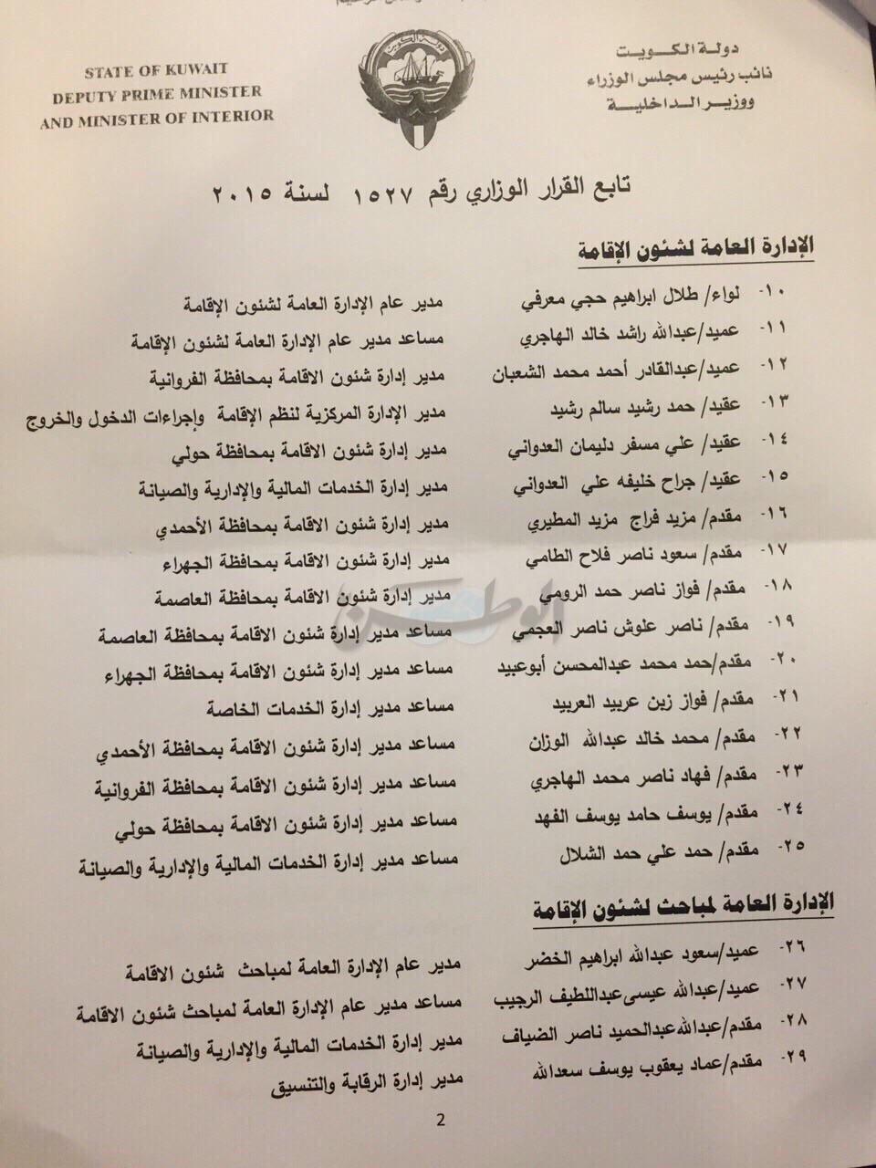 عميد يوسف سليمان حسين السنين – مدير عام الادارة العامة للجنسية ووثائق السفر الكويتية، عقيد خالد عبداللطيف عبدالرحمن البحوه – مساعد مدير عام الادارة العامة للجنسية ووثائق السفر، مقدم منصور فايز زايد المطيري – مدير ادارة البحث والمتابعة، مقدم خليفة فرج صالح الجوهر – مدير ادارة المكتب الفني، مقدم محمد حسين غنوم الكندري – مساعد مدير ادارة البحث والمتابعة، مقدم عبدالعزيز عبدالرحمن عبدالعزيز البحر – مساعد مدير ادارة الجنسية، مقدم عبدالله محمد عبدالرحمن العمهوج – مدير ادارة وثائق السفر، رائد احمد عبدالله علي الجمعة – مساعد مدير ادارة المكتب الفني بالوكالة، رائد محمد صالح نمش النمش – مساعد مدير ادرة وثائق السفر بالوكالة، مقدم فهد سليمان فهد الفهد – مساعد مدير ادارة مركز خدمة محافظة العاصمة، مقدم يوسف ابراهيم جاسم الشطي – مساعد مدير ادارة الخدمات المالية والادارية والصيانة، مقدم احمد مبارك احمد العصفور – مدير ادارة مراكز خدمة محافظة حولي، مقدم بدر عبدالكريم عبدالله الرباح – مساعد مدير ادارة رعاية المتقاعدين، مقدم ناصر زايد فلاح الهاجري – مساعد مدير ادارة مراكز الخدمات الخاصة، مقدم خالد مرزوق محمد الدلوم – مساعد مدير ادارة مراكز خدمة محافظة الجهراء، مقدم علي سعد فلاح الطامي – مساعد مدير ادارة مراكز خدمة محافظة حولي.