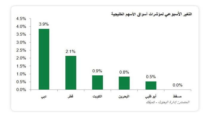 هذا وقد اختتمت كافة مؤشرات اسواق الاسهم الخليجية تداولاتها الاسبوعيه على مكاسب بقيادة سوق دبي المالي الذي نما بنسبة %3.9 يليه مؤشر بورصة قطر بنسبة %2.1 ثم مؤشر سوق الكويت للاوراق المالية بنمو %0.9 يليه مؤشر كل من بورصة البحرين وسوق أبو ظبي للاوراق المالية بنمو نسبته %0.8 و%0.5 على التوالي بينما اغلق مؤشر سوق مسقط للاوراق المالية بتغير طفيف قدره %0.01.