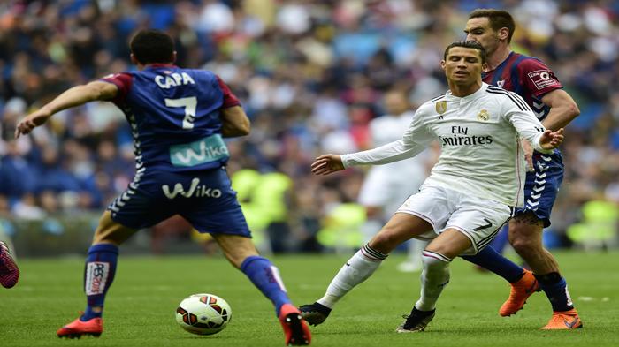 (د ب أ)- واصل المهاجم البرتغالي كريستيانو رونالدو ممارسة هوايته في هز الشباك واكتفى فريقه ريال مدريد بثلاثة أهداف ليحقق الفريق بمجموعة يغلب عليها نجوم الصف الثاني فوزا منطقيا 3/صفر على ضيفه إيبار اليوم السبت في افتتاح مباريات المرحلة الحادية والثلاثين من الدوري الأسباني لكرة القدم.