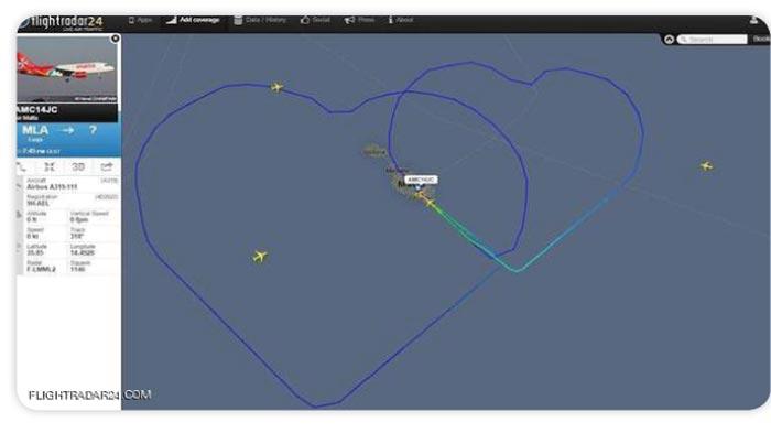 واندهش مستخدمو خدمات متابعة حركة الطيران على الانترنت، بعد ان لاحظوا ان شكل مسار احدى الطائرات التي أقلعت من مطار مالطا الدولي، أصبح على شكل قلب أثناء دورانها حول الجزيرة.
