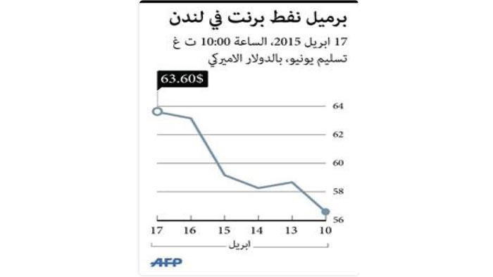 كما تراجع سعر الخام الأمريكي تسليم شهر مايو المقبل بحوالي %0.7 ليصل الى 56.3 دولارا للبرميل.