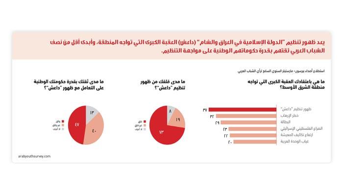 يعد ظهور تنظيم "الدولة الإسلامية في العراق والشام" (داعش) العقبة الكبرى التي تواجه المنطقة، وأبدى أقل من نصف الشباب العربي ثقتهم بقدرة حكوماتهم الوطنية على مواجهة التنظيم.