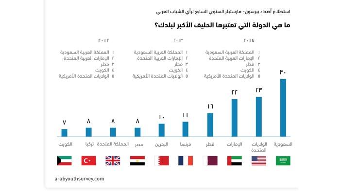 من جهة ثانية، اعتبر واحد من أصل كل 3 أشخاص (%30) السعودية كحليف أول لبلدانهم، تليها الولايات المتحدة (%23)، والإمارات العربية المتحدة (%22).