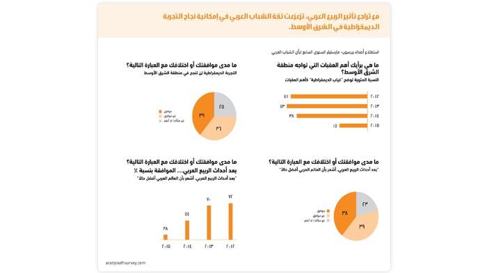 -1 مع تراجع تأثير الربيع العربي، تزعزعت ثقة الشباب العربي في إمكانية نجاح التجربة الديمقراطية في الشرق الأوسط تتراجع ثقة الشباب العربي بقدرة الربيع العربي على إحداث تغيير إيجابي في المنطقة.