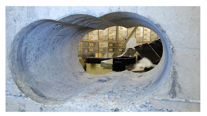 كشفت صور عرضتها شرطة لندن أن اللصوص استخدموا أدوات حفر من نوع خاص لعمل فتحة في الجدار الخرساني لشركة حفظ الأمانات البالغ سمكه نصف متر، ليستطيعوا الوصول إلى ودائع العملاء وسرقتها.