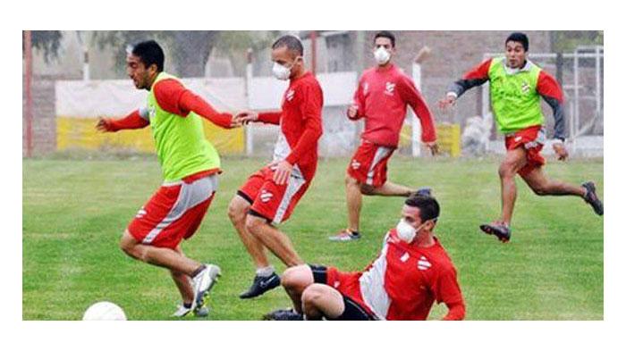 ارتدى لاعبو فريق للهواة أقنعة للوقاية من رماد بركان خلال مران أثناء الاستعداد لمواجهة ريسنج بطل الدوري الأرجنتيني لكرة القدم في مباراة بدور ال64 لكأس الأرجنتين.
