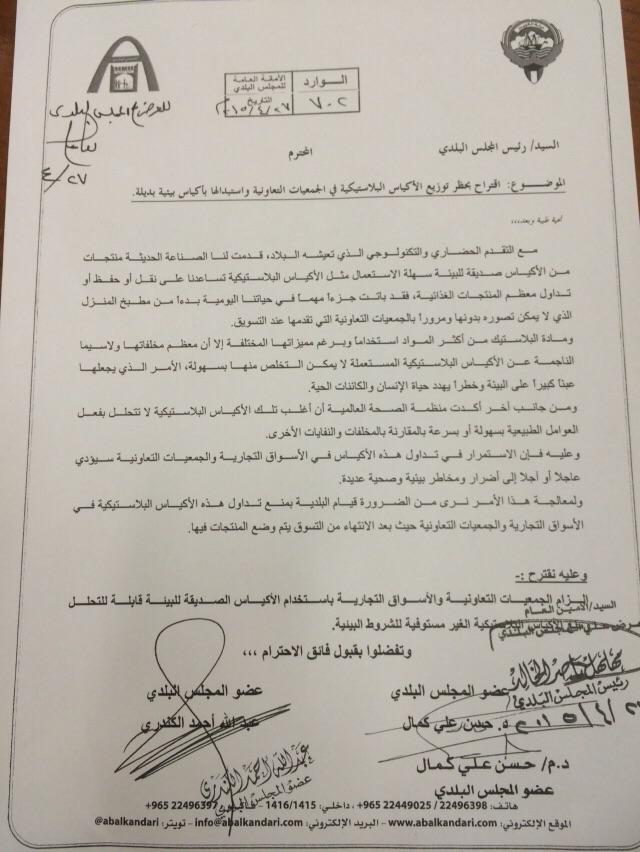 تقدم عضو المجلس البلدي عبدالله الكندري باقتراح يقضي بحظر توزيع الأكياس البلاستيكية في الجمعيات التعاونية، وذلك خلال الجلسة المنعقدة اليوم.