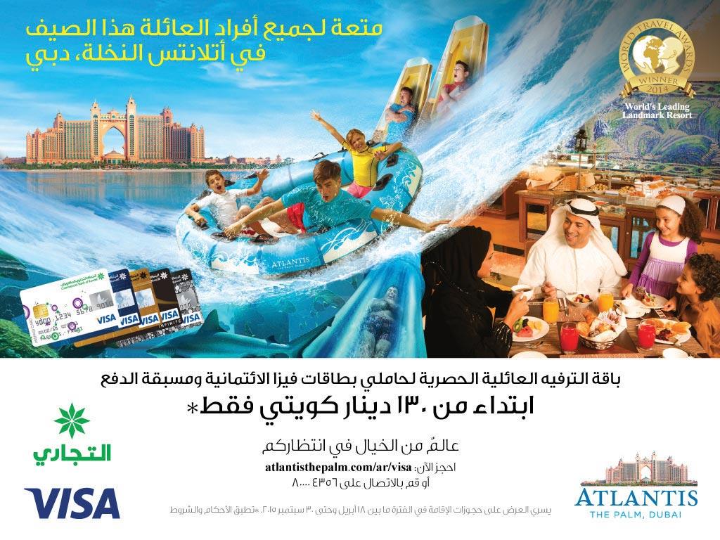 أعلن البنك التجاري الكويتي - بالتعاون مع فيزا انترناشيونال- عن اطلاق العرض المميز المقدم لعملائه للاستمتاع بموسم الصيف وقضاء وقت ممتع في منتجع أتلانتس النخلة، أحد أشهر وأرقى المنتجعات في امارة دبي، حيث يستطيع العملاء استخدام بطاقات فيزا الائتمانية والمسبقة الدفع الصادرة عن البنك التجاري للحجز في أتلانتس النخلة والاستفادة من هذا العرض الحصري الذي يتيح فرصة الاستمتاع بأجواء العطلة العائلية بقيمة 130 ديناراً كويتياً فقط. ويتضمن العرض مجموعة من المزايا مثل الاستمتاع بجلسات سبا وبوفيه افطار كامل واستخدام غير محدود لمدنية الألعاب المائية أكوافنتشر وغيرها من المزايا العديدة الأخرى، كما يستطيع العملاء القيام بالحجز من الآن حتى 17 سبتمبر 2015 للاستفادة من هذا العرض الحصري، كما يسري هذا العرض على فترات الاقامة بدءاً من 18 ابريل 2015 حتى 30 سبتمبر 2015.