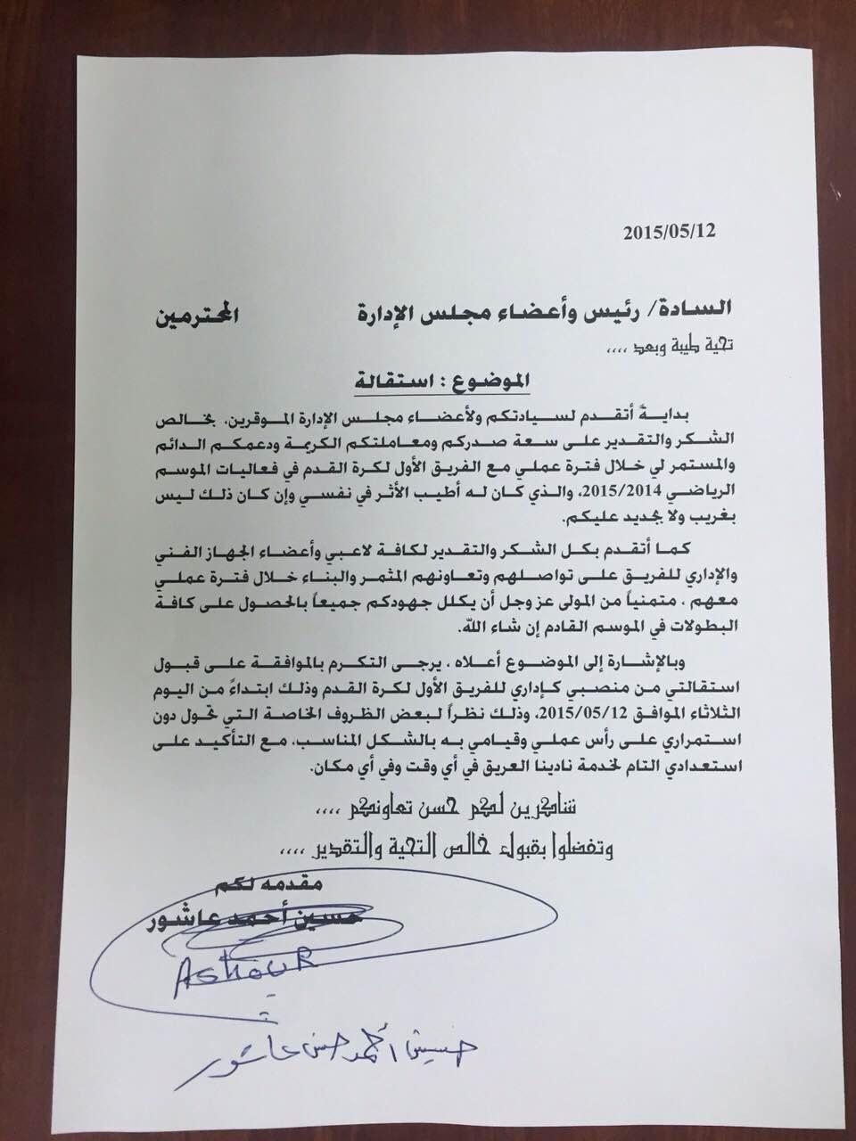 تقدم اداري الفريق الاول لكرة القدم بنادي العربي حسين عاشور باستقالته رسميا الى مجلس الإدارة وفي تصريحاً خاص قال عاشور ان مصلحة النادي فوق كل اعتبار وان الاشخاص زائلون والعربي باقي بزعامته.
