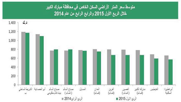فيما كانت محافظة مبارك الكبير أعلى المحافظات انخفاضاً في متوسط الأسعار بنسبة وصلت الى %6.6 اذ وصل سعر المتر المربع الى 779 دينارا خلال الربع الأول 2015 مقارنة بتراجع أقل نسبته %1.2 اذ كانت قد سجلت 835 دينارا خلال الربع الرابع 2014.