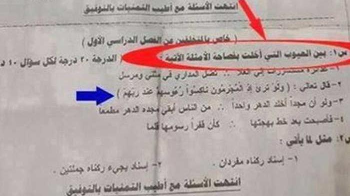 وكان طلاب منطقة أسوان، والتي لا تضم أكثر من 20 معهدًا، بحسب قول الأمير، قد فوجئوا عند أدائهم امتحانات مادة البلاغة السبت، بسؤال لـ"المتخلفين" وصفوه بـ"الكارثة"، حيث يتطلب السؤال، بحسب ورقة الامتحان، من الطالب أن يبين العيوب التي أخلت بفصاحة الأمثلة، وكان من بين الأمثلة الآية القرآنية الكريمة: "وَلَوْ تَرَىٰ إِذِ الْمُجْرِمُونَ نَاكِسُو رُءُوسِهِمْ عِندَ رَبِّهِمْ".