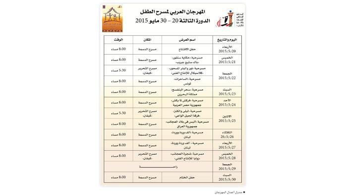 تحت رعاية وزير الاعلام وزير الدولة لشؤون الشباب رئيس المجلس الوطني للثقافة والفنون والآداب الشيخ سلمان الحمود تقام الدورة الثالثة للمهرجان العربي لمسرح الطفل خلال الفترة 30-20 مايو 2015. وأكد الأمين العام المساعد لقطاع الفنون في المجلس الوطني للثقافة والفنون والآداب محمد العسعوسي أهمية اقامة الدورة الثالثة للمهرجان العربي لمسرح الطفل في كي يطلع الجمهور في الكويت على التجارب المسرحية العربية والمحلية في مجال مسرح الطفل، والذي حقق نجاحا متميزا في الدورتين الماضيتين. وأشار العسعوسي الى ان حفل الافتتاح سيقوم باخراجه الفنان محمد الحملي بأسلوب فني يتناسب مع طبيعة المهرجان.