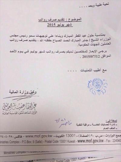 أودعت وزارة المالية اليوم الخميس رواتب موظفي الدولة بالبنوك تمهيدا لصرفها الاحد المقبل قبل اجازة عيد الفطر المبارك.