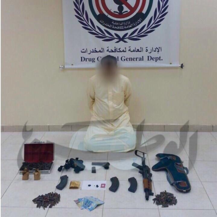 ألقت ادارة مكافحة المخدرات المحلية القبض على مواطن من ارباب السوابق ومطلوب لعدة جهات وبحوزته قطعتا حشيش وسلاح كلاشنكوف ومسدس وذخيرة بدون ترخيص في منطقة صباح السالم.