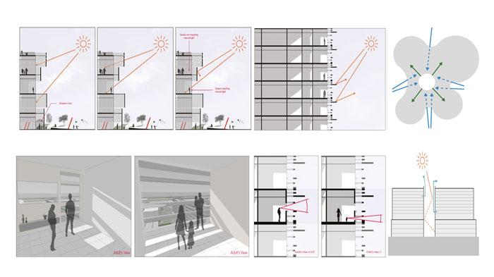 أما عن مخطط الفراغات الطبية الداخلية، فقد تم توزيع الخدمات الصحية المختلفة للأمومة و طب الأطفال، مثل عيادات الكشف المختلفة، و غرف العمليات، و غرف الولادة، و قسم الجراحة، و قاعة المحاضرات، على طوابق المنصة الأربعة الأولى، إضافة إلى المدخل الرئيسي و الاستقبال و المداخل الخدمية الأخرى بالطابق الأرضي، مع سرداب يضم قسم السجلات الطبية و المخازن و قسم الطب الحيوي، أما الأبراج العليا فقد خصصت أدوارها المتكررة لتشتمل على أجنحة ما بعد الولادة و المرافق المصاحبة لها و على الوحدات الطبية و الجراحية الداخلية للطب النفسي للأطفال (Surgical & Medical IP Units)، علاوة على جناح للمختبرات و للإدارة الطبية في الطابق الأخير.