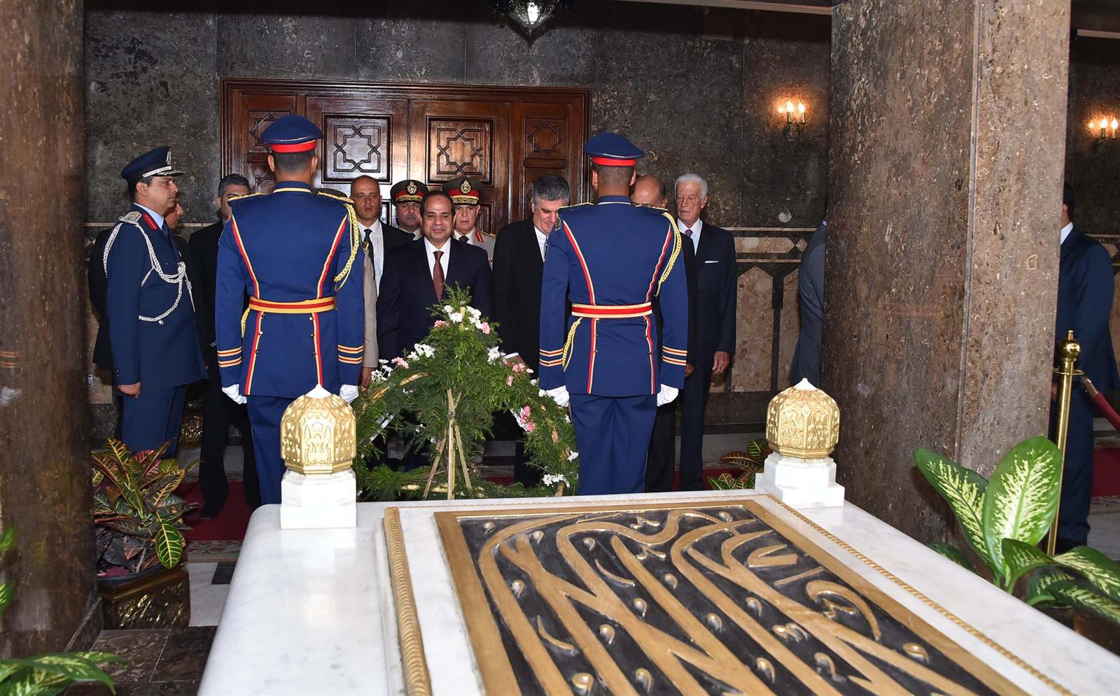 وعقب ذلك، وضع السيسي إكليلاً من الزهور على قبر الرئيس الراحل محمد أنور السادات، وإكليلاً آخر على قبر الراحل جمال عبد الناصر.