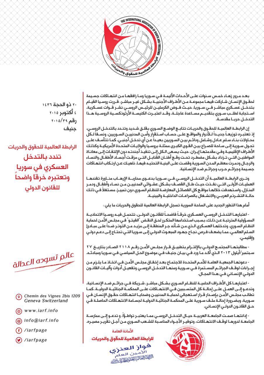 إن الرابطة العالمية للحقوق والحريات تتابع الوضع السوري بقلق شديد وتندد بالتدخل الروسي، إذ تعتبره توزيعاً جديداً للأدوار والمواقع على حساب استقرار وأمن المدنيين السوريين، ونسفاً لكل محاولات بناء سلم عادل وشامل ودائم بين السوريين بعيداً عن أي تدخل أجنبي.