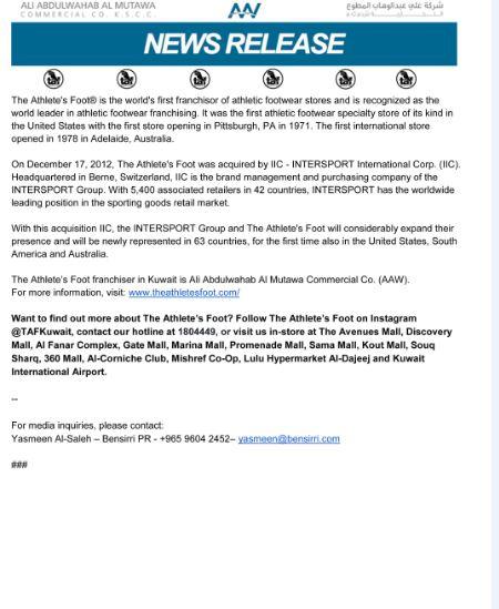 أعلنت شركة علي عبدالوهاب المطوع التجارية اليوم عن افتتاحها الفرع الثالث عشر من محلات "ذي أثليتس فوت" في الكويت في مجمع بروميناد في حولي.