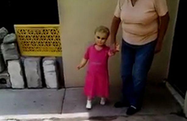 تداول مستخدمو مواقع التواصل الاجتماعي مقطع فيديو يظهر دمية لديها عيون سوداء ضخمة تستطيع المشي بجانب البشر إذا مسكوا يدها.