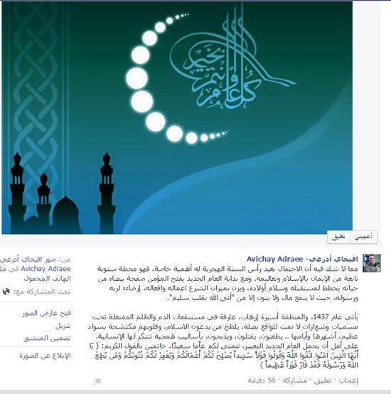 وكتب أفيخاي في تدوينته على فيس بوك: "ومما لا شك فيه أن الاحتفال بعيد رأس السنة الهجرية له أهمية خاصة، فهو محطة سنوية نابعة من الإيمان بالإسلام وتعاليمه ومع بداية العام الجديد يفتح المؤمن صفحة بيضاء من حياته يخطط لمستقبله وسلام أولاده، ويزن بميزان الشرع أعماله وأفعاله، إرضاءً لربه ورسوله، حيث لا ينفع مال ولا بنون إلا من "أتى الله بقلب سليم".