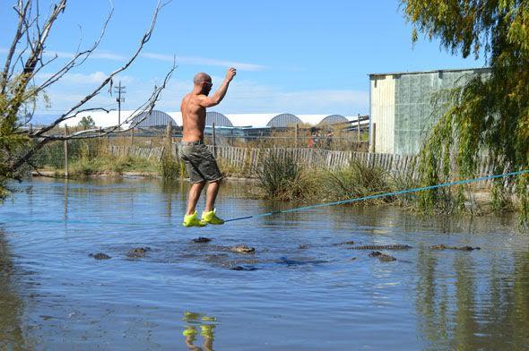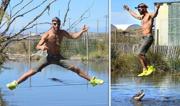 لم يجد الأمريكي "جوش بودوين" (33 عاماً)، محترف السير على الحبال، أيَّ مشكلة في تصوير مغامرته المروعة التي قام فيها بالسير على الحبال فوق نهر يعج بالتماسيح الجائعة، والقيام بحركات بهلوانية قد يعني الخطأ فيها نهاية حياته بين فك التماسيح التي تراقبه من أسفل.