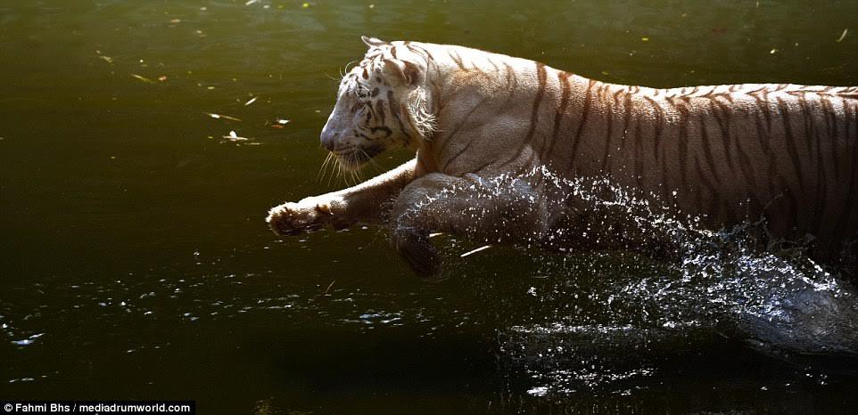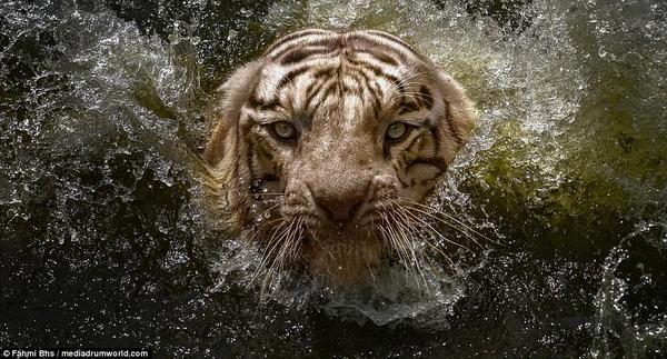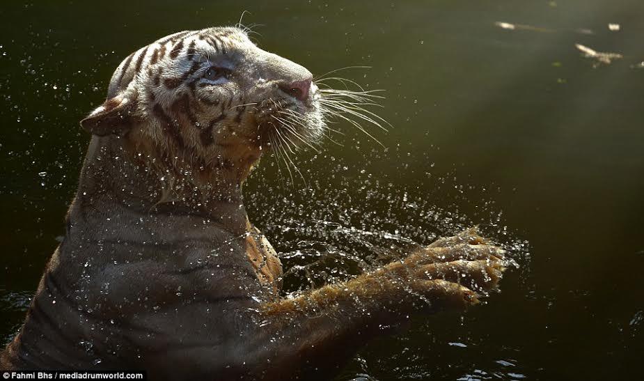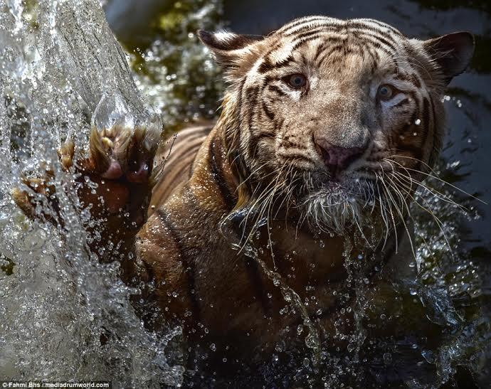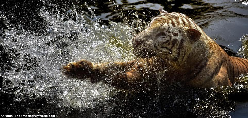 قرر مصوّر إندونيسي أن يغامر بحياته من أجل التقاط صور خاصّة لنمر بنغالي في أثناء خروجه من المياه، خلال فترة إطعامه من قِبل عمال حديقة "راغونان" بالعاصمة "جاكرتا".