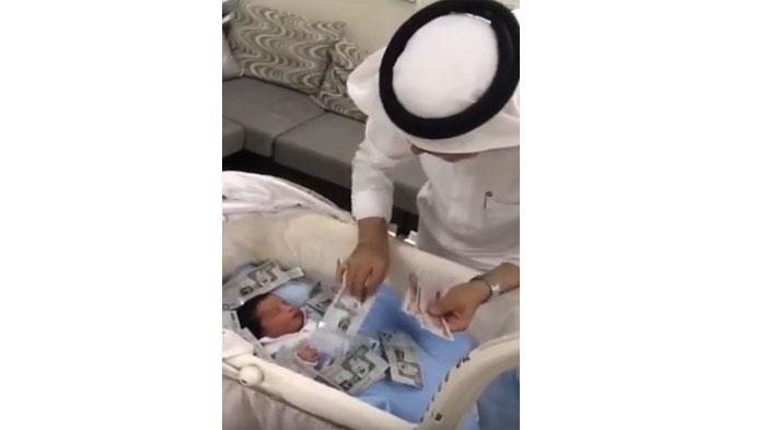 استقبل الجدٌّ حفيدَه المولود بطريقته؛ حيث أمسك آلاف الريالات وألقاها على حفيده الذي لم يتجاوز عمره أياماً، وهو يردد “تستاهل.. الله يحييك”.