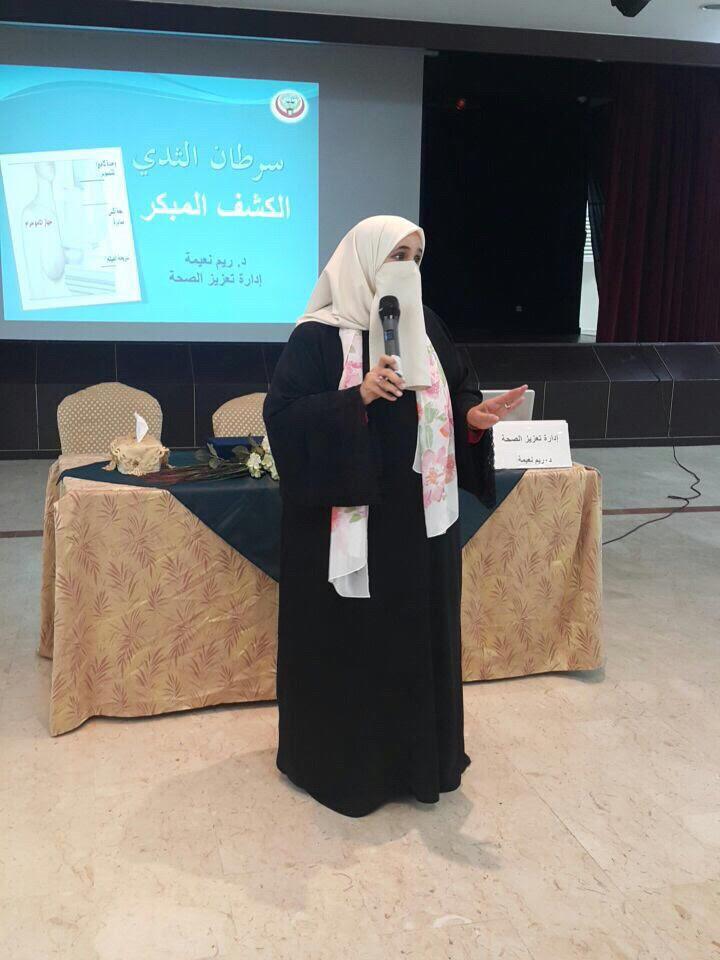 وأوضحت الندوه التوعوية التي ابتدأتها د. ريم نعيمة بأن سرطان الثدي هو الأكثر شيوعا بين النساء في الكويت وركزت على ضرورة الفحص الذاتي للنساء خاصة للنساء فوق سن ٤٠ وممن لديهن تاريخ عائلي لقريبات من الدرجة الاولي أصبن بسرطان الثدي وممن تزوجن في سن متاخرة او انجبن في سن متأخرة أو لم ينجبن.