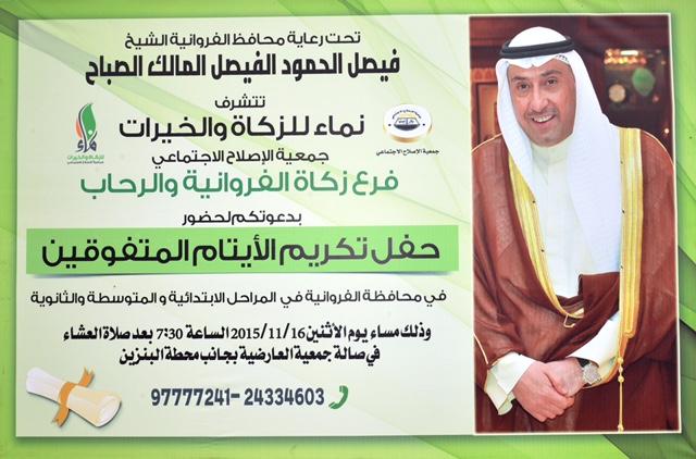 يرعى محافظ الفروانية الشيخ فيصل الحمود المالك الصباح، حفل تكريم الأيتام المتفوقين، والذي تقيمه جمعية الإصلاح الإجتماعي فرع زكاة الفروانية والرحاب يوم الاثنين المقبل الموافق 2015/10/16 بعدة صلاة العشاء في صالة جمعية العارضية.