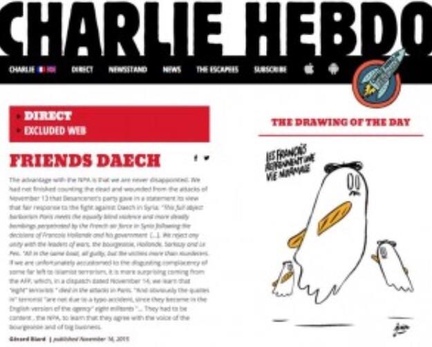 وترافق الرسوم الكاريكاتورية ملاحظة رئيس التحرير جيرارد بيان بعنوان "أصدقاء داعش"، وانتقد الصحفي في مقاله الحزب الجديد المناهض للرأسمالية، الذي أدان زيادة القصف الفرنسي لـداعش في سورية، ردا على الهجمات في باريس.