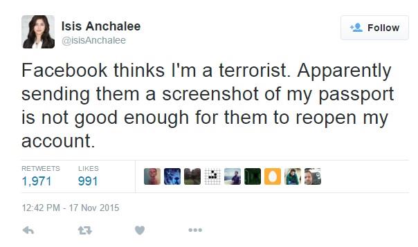 الفتاة “إيزيس أنتشالي Isis Anchalee”، وهي مهندسة معمارية من ولاية سان فرانسيسكو، اشتكت على تويتر، يوم الإثنين الماضي، أن إدارة فيسبوك قامت بتعطيل حسابها، متسائلة عن سبب ذلك، ومصرحة أن اسمها الحقيقي هو “إيزيس Isis”.