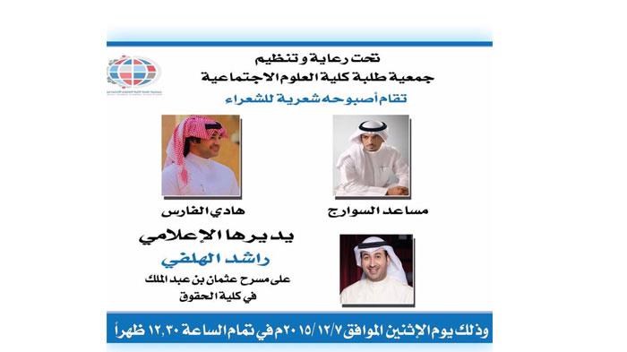 تقيم جمعية طلبة كلية العلوم الاجتماعية أصبوحة شعرية بمشاركة الشاعرين مساعد السوارج هادي الفارس. ويدير الأصبوحة الإعلامي راشد الهلفي على مسرح عثمان بن عبدالملك في كلية الحقوق وذلك في يوم الاثنين الموافق 7/12/2015 في تمام الساعة 12.30ظهراً.