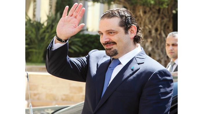 الحريري يحيي الحضور في ساحة المقر الحكومي في بيروت (رويترز)