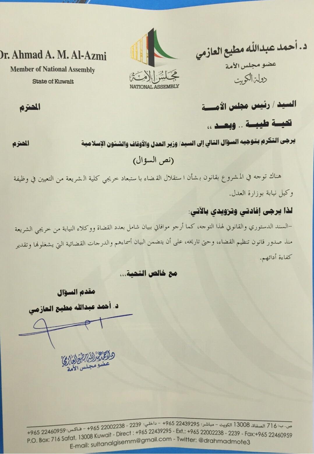 هذا وقد وجه النائب د.أحمد مطيع العازمي سؤالا لوزير العدل والأوقاف والشؤون الإسلامية يستفسر من خلاله عن التوجه لاستبعاد خريجي كلية الشريعة من التعيين في وظيفة وكيل نيابة في وزارة العدل وذلك كما جاء في المشروع بقانون بشأن استقلال القضاء .
