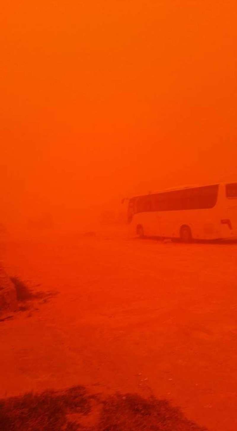 تحول الجو في مدينة "طبرق" الليبية على ساحل البحر المتوسط الشرقي قرب مصر إلى اللون الأحمر، بعدما اجتاحته عاصفة غبار خانقة، وفقاً لتقارير وردت عبر وسائل الإعلام الاجتماعية.
