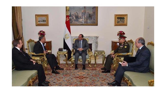 وقال بيان لمكتب إعلام الوزارة، ان "العبيدي توجّه وفور وصوله القاهرة إلى قصر الاتحادية، حيث التقى الرئيس المصري عبدالفتاح السيسي، وأطلعه على تطورات الموقف القتالي للقوات المسلحة العراقية والانتصارات التي تحققها على المجاميع الإرهابية على مختلف الجبهات"، مؤكداً على "ضرورة أن يبادر الأشقاء العرب بدعم العراق وتقديم الإسناد له". ونقل البيان عن الرئيس المصري، تأكيده "موقف مصر الثابت في دعم العراق في المجالات كافة واستعدادها لتفعيل أوجه التعاون العسكري بين البلدين"، مثمناً "التضحيات العظيمة للشعب العراقي ودفاعه الباسل عن مقدراته الوطنية في مواجهة قوى الإرهاب". وفي سياق متصل، استقبل وزير الدفاع المصري الفريــق أول صدقي صبحي ظهر يــــوم الثلاثـــاء، في مقر وزارة الدفاع المصرية وزير الدفاع خالد العبيدي والوفد المرافق له. وتحدّث بيان للدفاع العراقية، عن "مراسيم استقبال رسمية للعبيدي شارك فيها عدد من قادة وزارة الدفاع المصرية"، مشيرة إلى أن "الجانبين وبعد انتهاء مراسيم الاستقبال جرت بينهما جولة المباحثات الأولى".