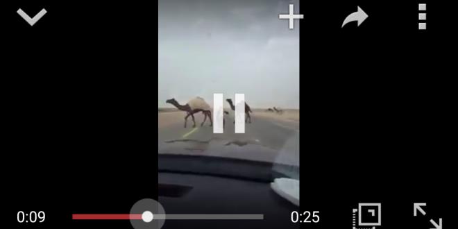 ويظهر المقطع رجل يحمل سلاحا من نوع “رشاش” محاولا تأمين عبور مجموعة من الأبل للطريق، ويطمئن سائقي المركبات العابرة للطريق بأن عبور أبله لن يستغرق وقتا قائلا “أبشر أبشر”.