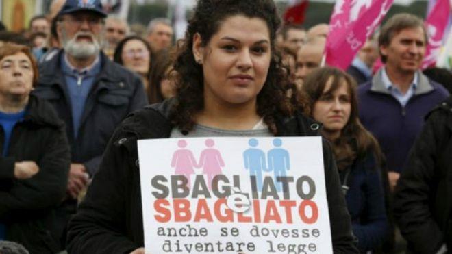 تظاهر الآلاف في العاصمة الإيطالية روما احتجاجا على مشروع قانون يعترف بزواج المثليين من الرجال والنساء، ومنحهم حقوق التبني.