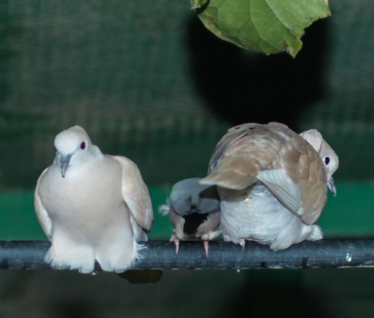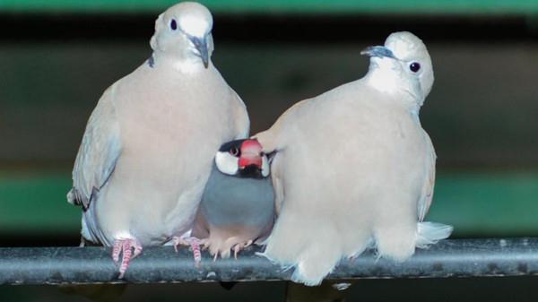 صور _ حمامتان تضمان عصفوراً لتدفئته