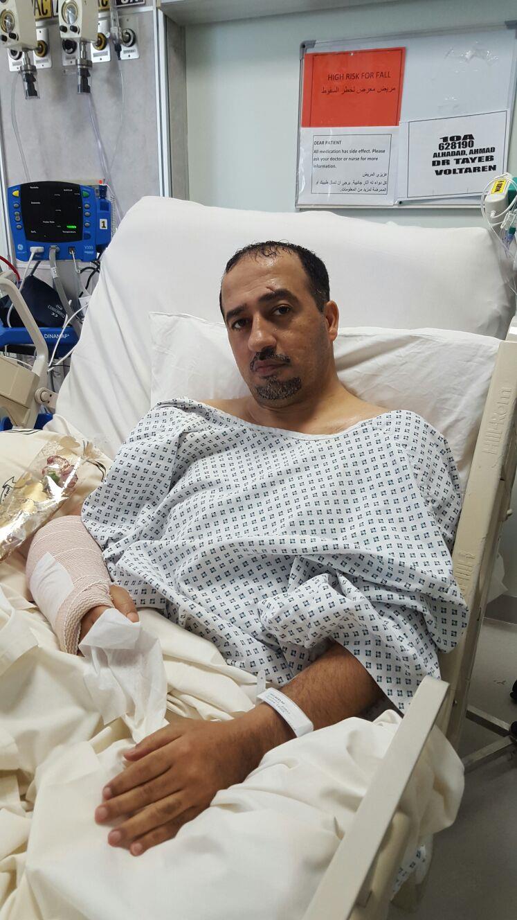 وأضاف الحداد: "اقتربت حتى كانت المفاجأة بمقابلة الإرهابي فحاولت الابتعاد لكني لم أستطع، فأطلق النار وأصابني في يدي وفي فخذي حتى انتهت ذخيرته فسقطت مصاباً".