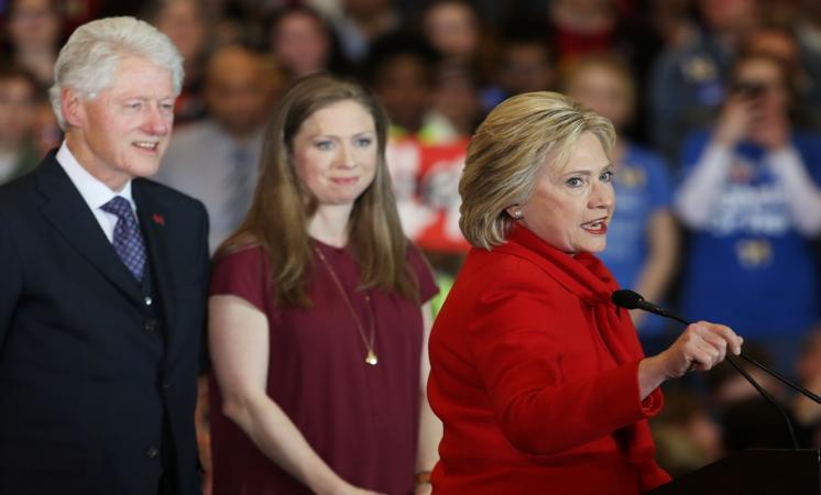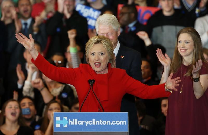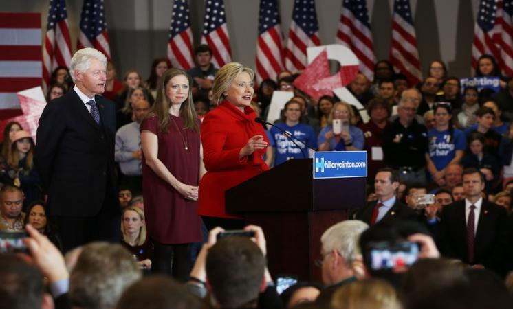 المرشحة عن الحزب الديموقراطي هيلاري كلينتون تعبر عن فرحتها بالفوز على خصمها ساندرز في الانتخابات التمهيدية التي جرت في ولاية أيوا الامريكية ويقف بجانبها الرئيس الأمريكي الأسبق بيل كلينتون وابنتهما تشيلسي.
